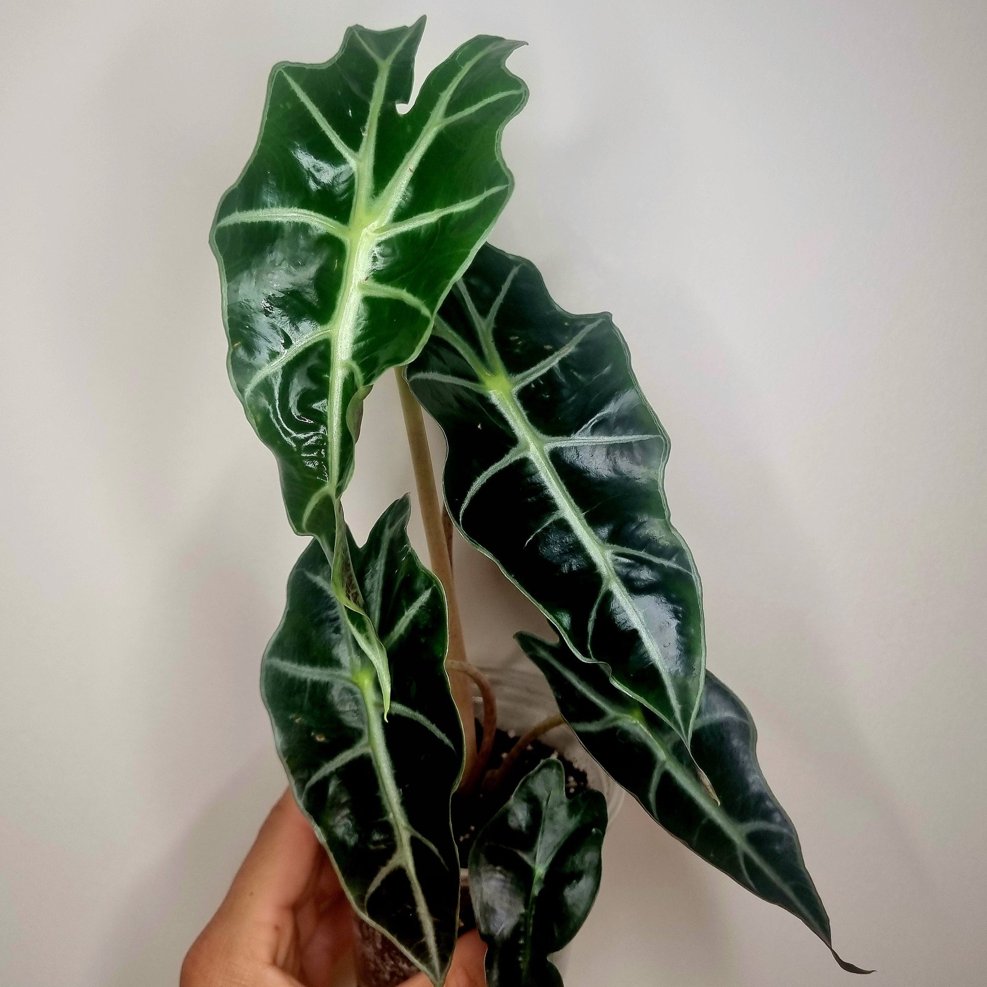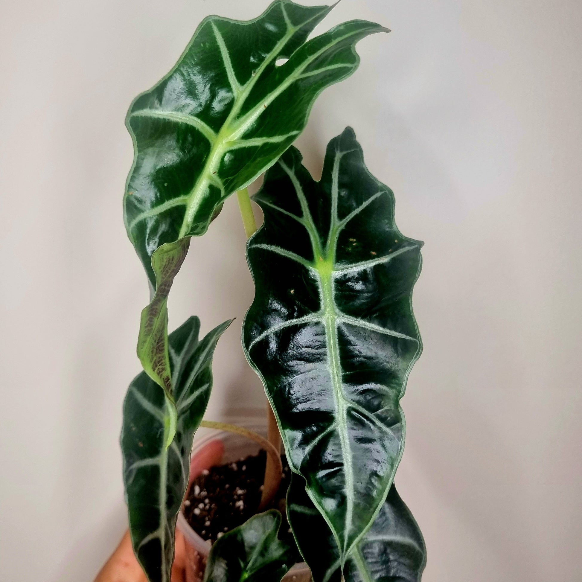 L'alocasia Polly est une des alocasias les plus facile d'entretien. Ses feuilles vert sapin quasiment noir tranchent avec ses veines blanches voir argentées et lui donne un aspect très décoratif. Ses feuilles peuvent devenir très grosses si elle reçoit de bon soins.